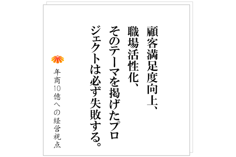 若手を集めてのプロジェクトも同様の有様です。そのプロジェクトのテーマは、「お客様満足度向上」や「職場活き活き」などという、曖昧なものが掲げられています。それについて最初は其々の想いを発表するものの、テーマを絞ることができません。具体的な目標がないのです。それを数回、数か月続けても、何も変わらない、何も積み上がらないのです。