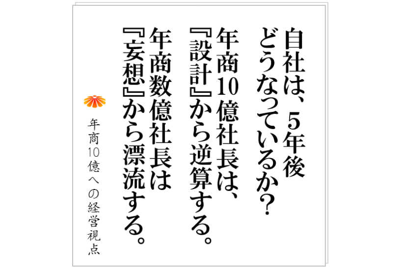 「5年後、3年後、どれぐらいまでいっているか」という「願望」を立てるやり方です。5年後の売上げ、社員数、社屋、エリアなど。