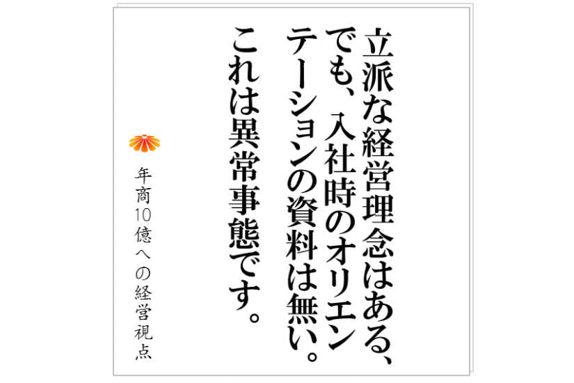 小学校の遠足以下の会社が多すぎるのです。経営理念はあっても、入社時のオリエンテーションやその資料がない、は異常事態です。