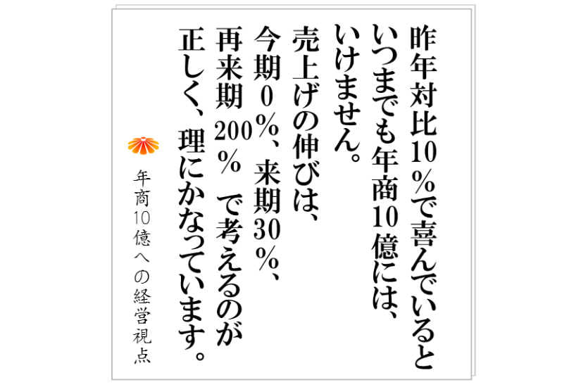 年商10億の社長は、今期0%、来期30%、再来期200%と考えます。