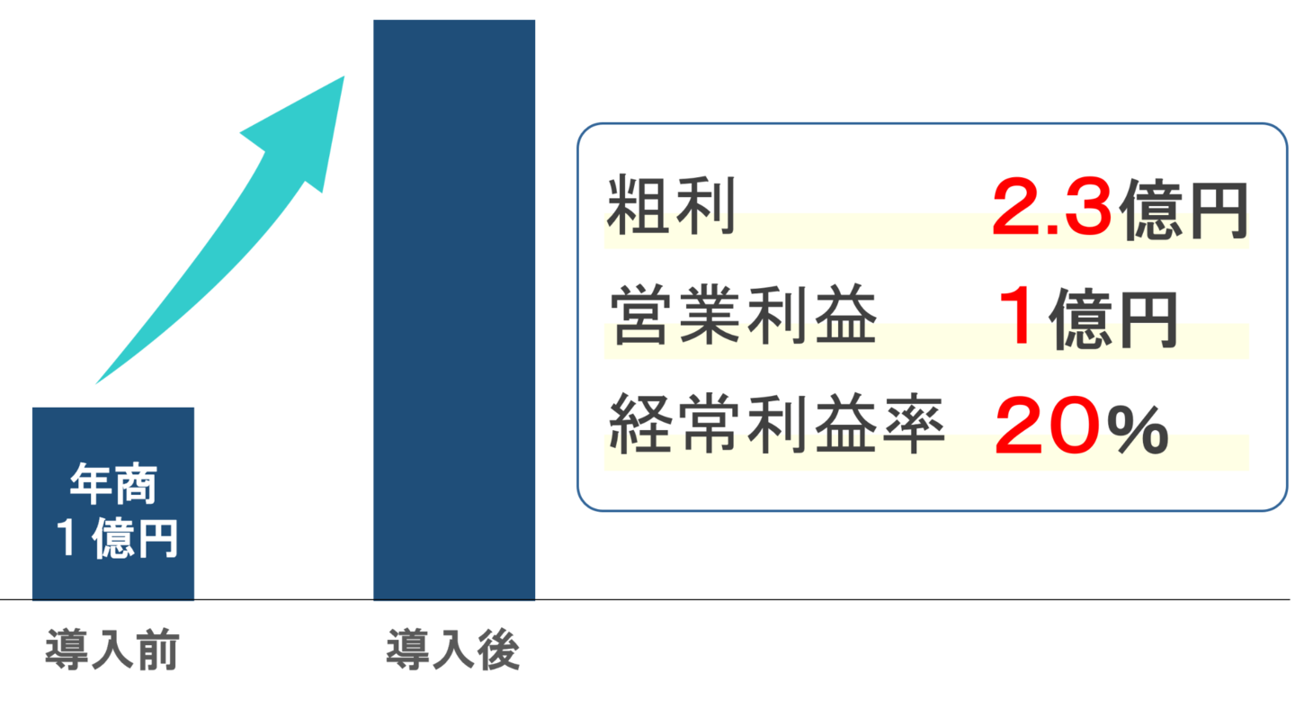 コロナ禍で売上が9割減だったところから、その2年後には過去最高益を出すことができました。導入前は年商1億円ほどでしたが、現在は粗利で2.3億円、営業利益1億円、経常利益率20%を達成しています。